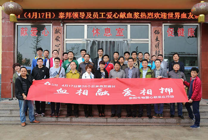 2016年4月16-17日,為迎接第28個世界血友病日的到來,山東泰邦生物制品有限公司組織員工五十余人到寧陽漿站舉行了捐獻血漿公益活動。活動以血相融 愛相擁為主題,旨在以泰邦人的實際行動號召更多的愛心人士加入到獻漿隊伍,提高公眾對于血友病(凝血功能障礙遺傳性疾病)的關(guān)注度,喚起全社會對于血友病患者的關(guān)愛和支持。...